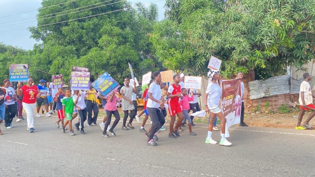 The procession began at the Ningo Roundabout, moved through Mandela Road, continued past the Water Works, and concluded at the church premises, where participants engaged in an energetic aerobics session.